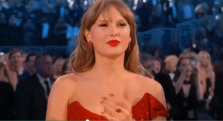 台下的泰勒斯威夫特虽带微笑但略显尴尬地鼓掌!尔后用力与人碰杯......